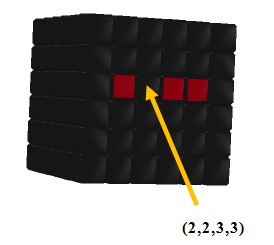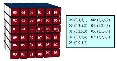筆者在前面介紹了用於這一步的兩種技巧-「先入後避法」和「先避後入法」,這兩種技巧同樣適用於更高階的魔方。不過當魔方的階數很高時,這個步驟會很費時間;而且要找出適當的中心塊以移入適當的位置,也已不是簡單的事,這時我們可以利用中心塊的「特徵數列」以幫助完成這個步驟。舉例說,假設我們正處理6 × 6 × 6魔方紅色面的某個「中心行」,只剩下一個中心塊尚未歸位,如下圖所示: