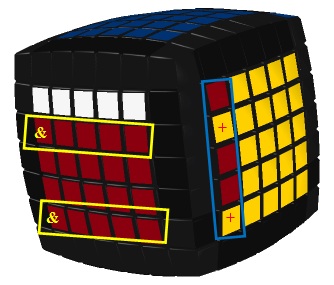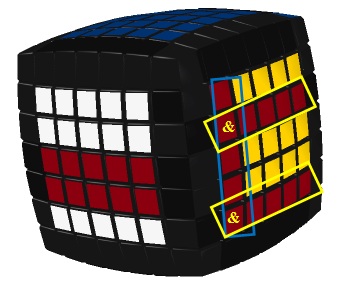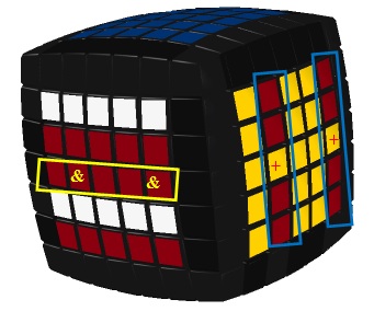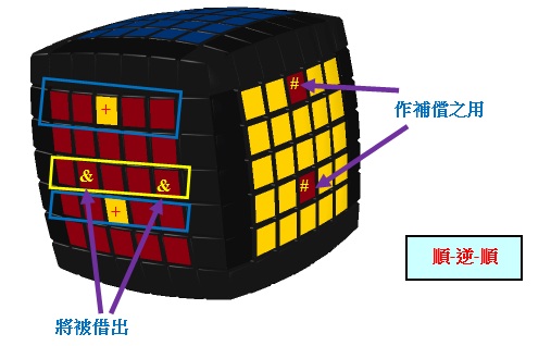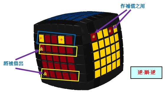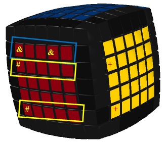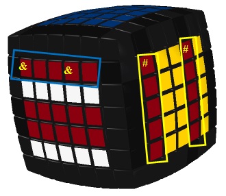藍框行既已「借入」了兩個「&」號小面,便要把它送回原位,因此接著根據「逆-順-逆」口訣,我們順時針旋轉黃色面90°,並進行U1。這樣做的結果是,把藍框行送回原位,而兩個黃框行雖然各「借出」了一個「&」號紅色小面,但各獲得一個「#」號紅色小面以作為「補償」,如下圖所示: