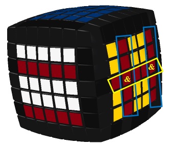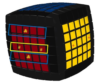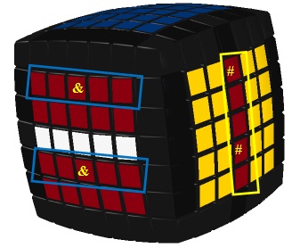 兩個藍框行既已「借入」了「&」號小面,便要把它們送回原位,因此接著根據「順-逆-順」口訣,我們逆時針旋轉黃色面90°,並同時進行U1和D2−1。這樣做的結果是,把兩個藍框行送回原位,而黃框行雖然「借出」了兩個「&」號紅色小面,但獲得兩個「#」號紅色小面以作為「補償」,如下圖所示: