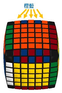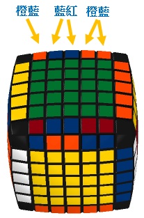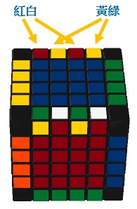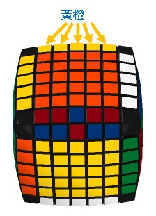 筆者在前面介紹了用於這一步的「有借有償法」,此法同樣適用於更高階的魔方。不過,在條件許可的情況下,我們有時可以同時進行多個「借」與「償」的過程,這樣做可以加快還原魔方的進程。以下首先看一個「多行向一行借出中心塊」的例子,假設我們的7 × 7 × 7魔方現在餘下前面(即紅色面)和右面(即黃色面)的「中心區」尚未搞定,如下圖所示: