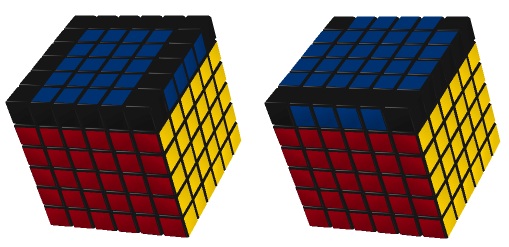 可是,對「偶數階魔方」而言,情況卻不是這樣。如前所述,每一條邊上的對稱邊塊屬於同一個軌道,由於對稱邊塊必定成雙出現,而「偶數階魔方」又沒有「正中邊塊」,所以「偶數階魔方」任一條邊的「邊區」若出現翻轉,必然令每個「邊塊軌道翻轉數總和」同時加2。如果在進行第四步前,魔方的上面出現一個或三個「邊區」朝向正確方向的情況,那麼每個「邊塊軌道翻轉數總和」將等於6或2,這兩個數字在「模2加法」下都等於0,並不違反「定理13」。因此「偶數階魔方」是可能出現一個或三個「邊區」朝向正確方向的情況,例如下圖便展示6 × 6 × 6魔方可能出現的這兩種情況: